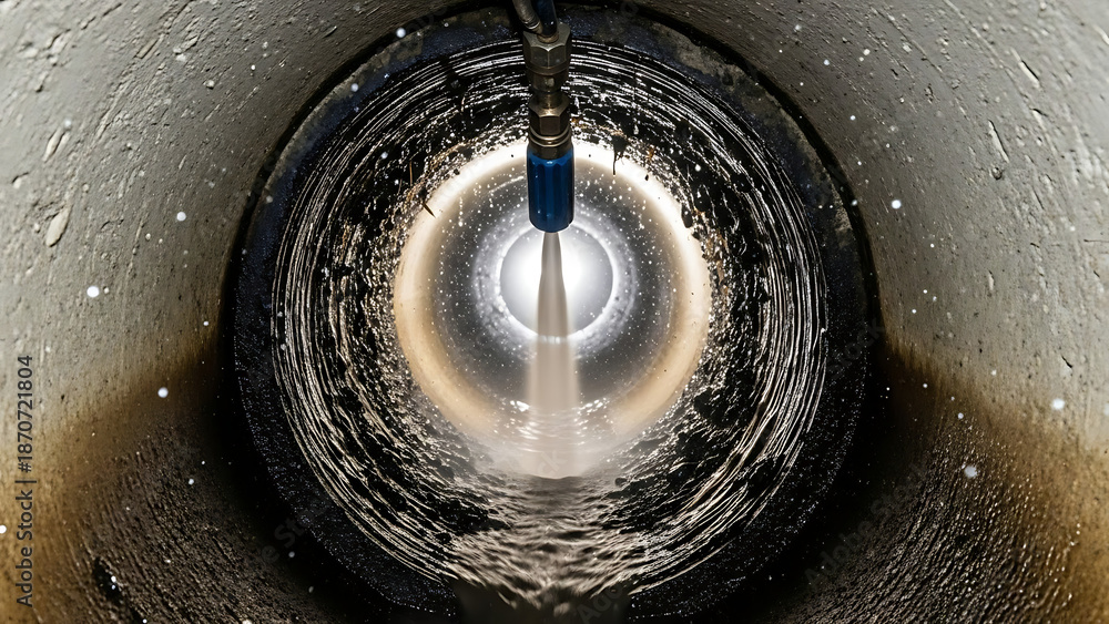 Maintenance of a severed main sewer pipe undergoing intensive hydro jet cleaning with a high-pressure water stream effectively clearing blockage debris and residue for sanitation service. #1870721804