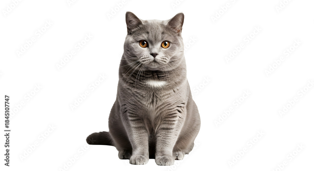 Majestic British Shorthair cat with stunning orange eyes sits attentively isolated on a black background #1845107747