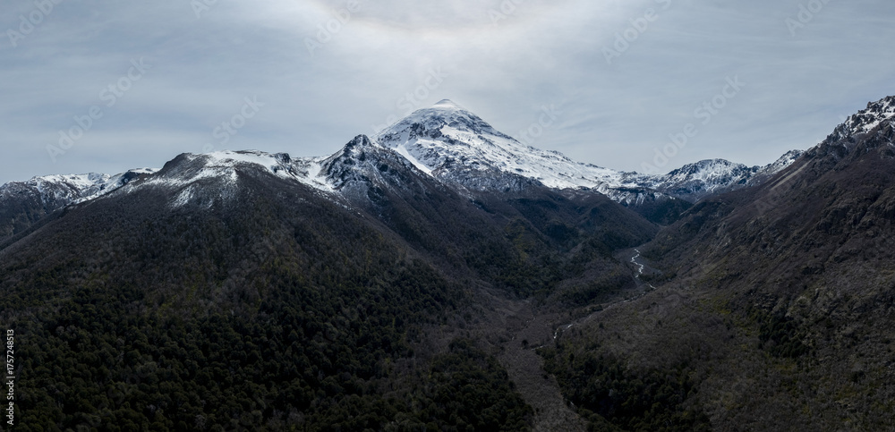 Majestic Snow Capped Lanin Volcano Peak Over Dark Valley on a cloudy Day. Patagonia, Argentina #1757248513