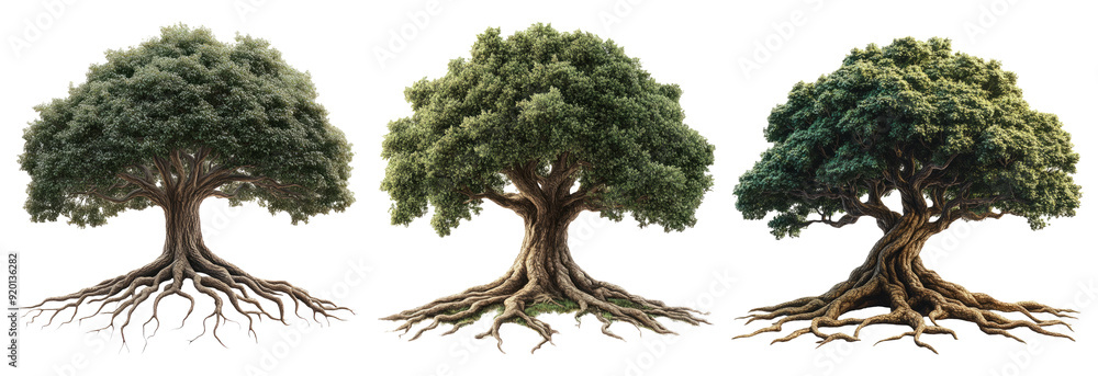 Majestic tree set isolated on transparent background with strong roots and lush foliage nature and growth #920136282