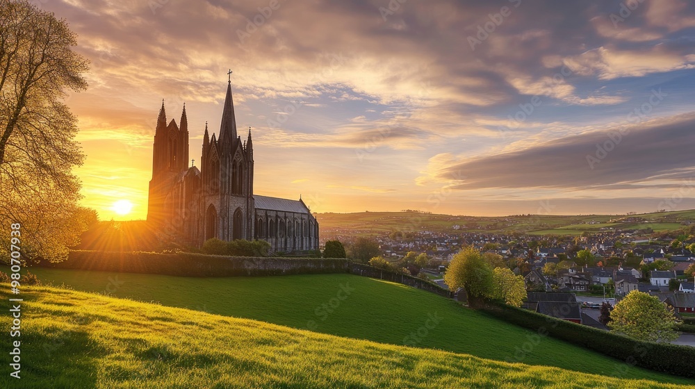 Majestic view of Downpatrick's Cathedral Church, Northern Ireland, with its grand Gothic architecture and serene surroundings. #980707938
