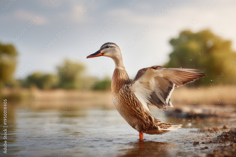 Mallard duck standing by water flapping wings, splashing sunlit drops #1950018405