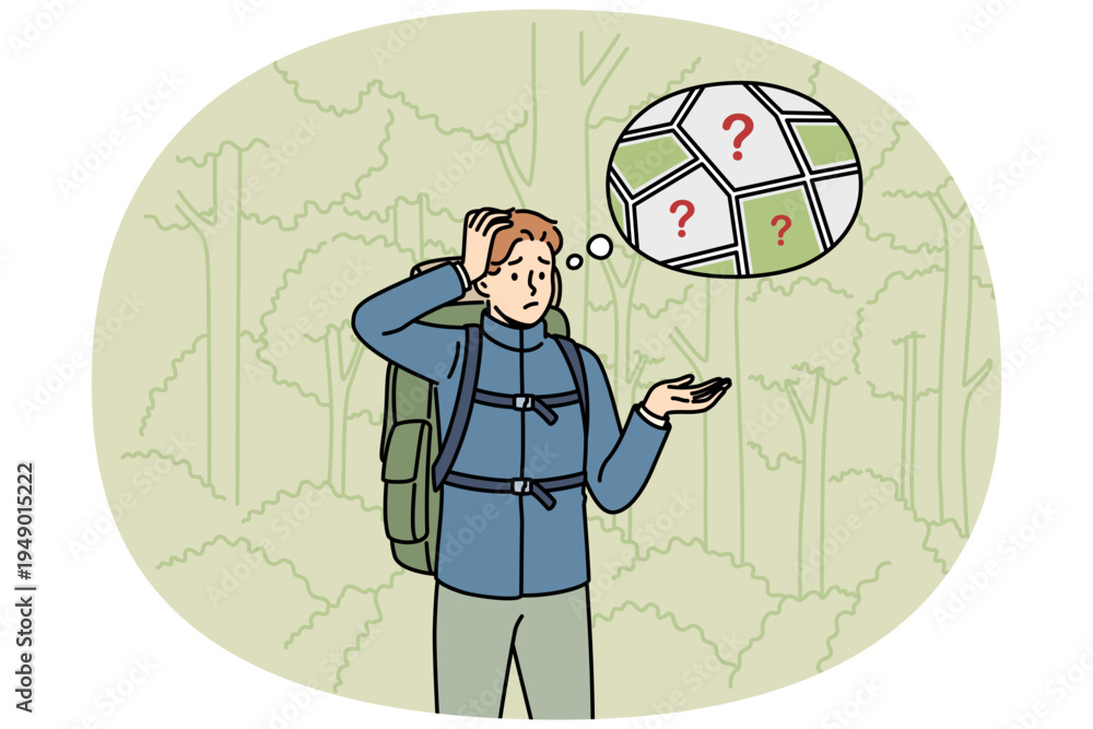 Man gets lost in forest and stands among trees, remembering route to house or highway. Confused guy gets lost and needs help from rescue service to avoid encountering wild animals. #1949015222