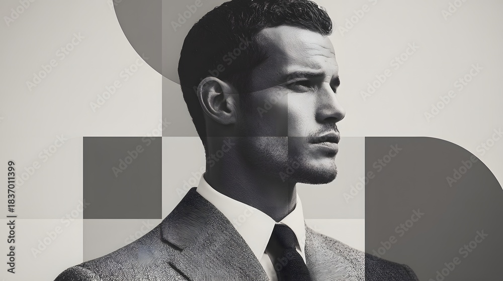 Man in a suit and tie is the main focus of the image. The man is wearing a tie and is standing in front of a white background. The image has a modern and sophisticated feel to it #1837011399