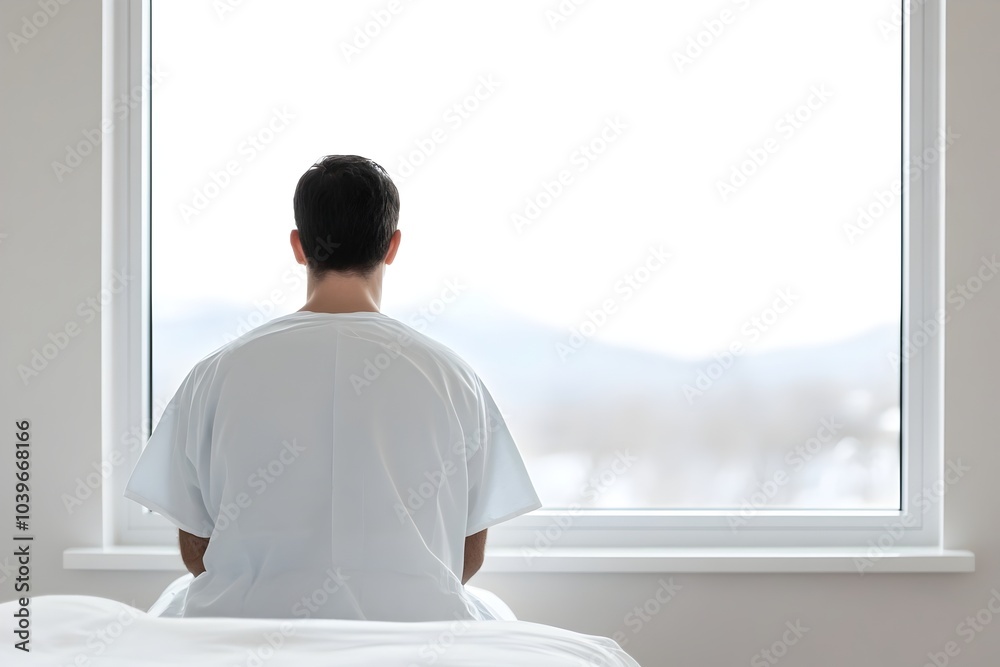 Man in Hospital Gown Gazing Out Window Lost in Pensive Contemplation #1039668166