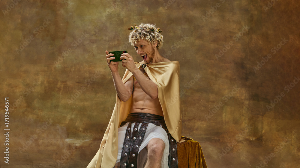 Man in toga playing on smartphone with excited exaggerated reaction. Concept of online entertainment, playful lifestyle parody, social media humor, and modern gaming culture in antique style. #1719546571
