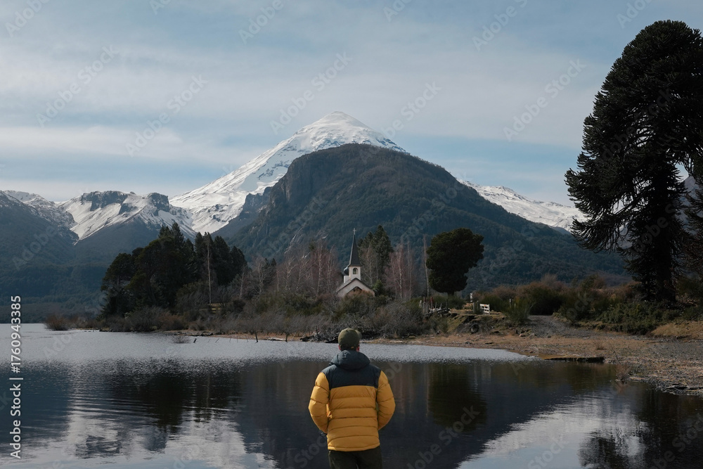 Man rear view Looking at a Snow Capped Lanin Volcano Reflected in Paimun Lake. Neuquen, Argentina #1760943385