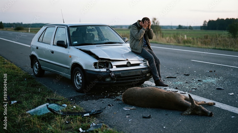 Man sits on his car after hitting a deer in a road accident. Sad driver with broken car bumper next to animal carcass. Unfortunate incident concept. #1893049638