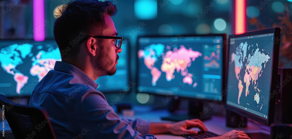 Man works on multiple computer monitors in dark tech office. Screens display global maps with colorful data visualizations, charts, graphs. Analyzes geographic info, big data, performing advanced #1754862758