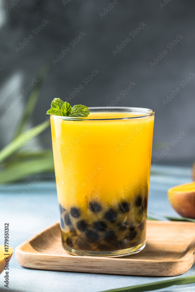 Mango smoothie with boba pearls, creamy mango lassi bubble tea, tropical summer drink #1779551312