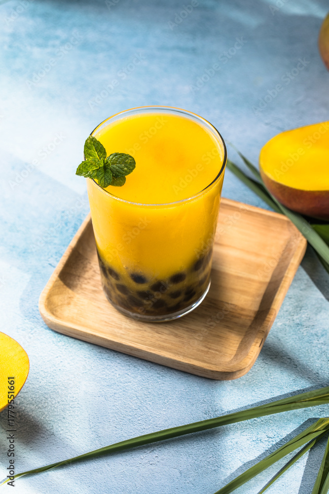 Mango smoothie with boba pearls, creamy mango lassi bubble tea, tropical summer drink #1779551661