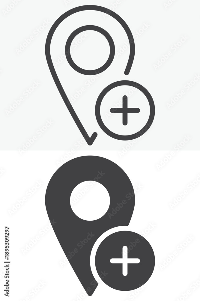 Map pin add plus different style icon set. Line, outline and solid icon vector sign symbol with editable stroke. Add location icon for new places. #1895309297