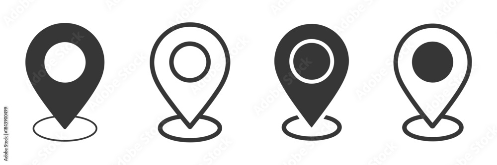 Map pin icon vector set, location symbol for maps, navigation apps, GPS services, travel, directions, geographic markers, and location-based interface design. #1843900499