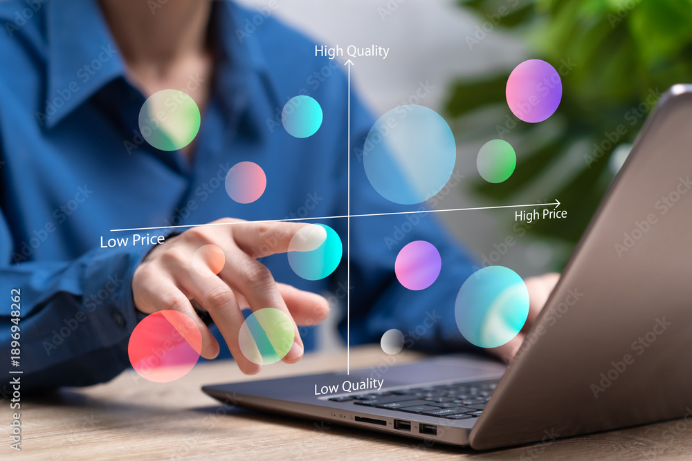 Marketing positioning strategy and perceptual map concept, Businesswoman analyzing target audience, Brand differentiation, Competitive landscape, Marketer pointing positioning map, Strategic brand #1896948262
