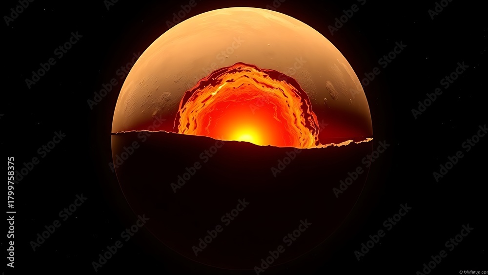 mars. A cross-section visual of Mars revealing its glowing, solid metallic core at the center. STEM education sheets, lab safety posters, designed for biotech research communications. #1799758375