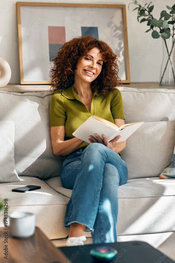 Mature beautiful woman reading a book while drinking a cup of coffee sitting on couch at home. #1943316298
