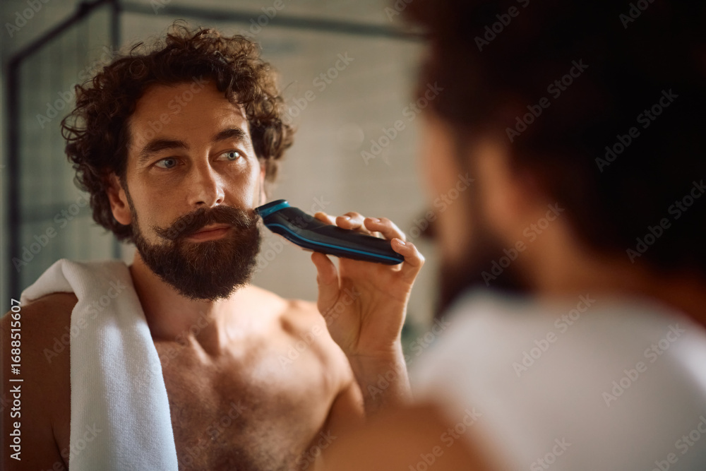 Mature man using electric razor while shaving in bathroom. #1688515607