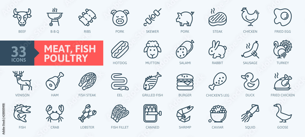 Meat, poultry, fish and eggs - minimal thin line web icon set. Outline icons collection.Simple vector illustration. #288001418