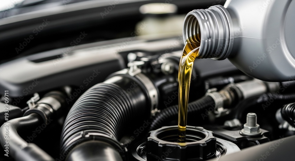Mechanic pouring engine oil into car engine for maintenance #1932909711