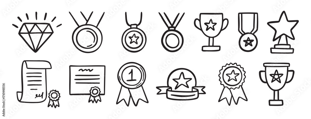 medal honor award related doodle hand drawn icon set. Outline drawing winner line clipart symbol collection #1761448556
