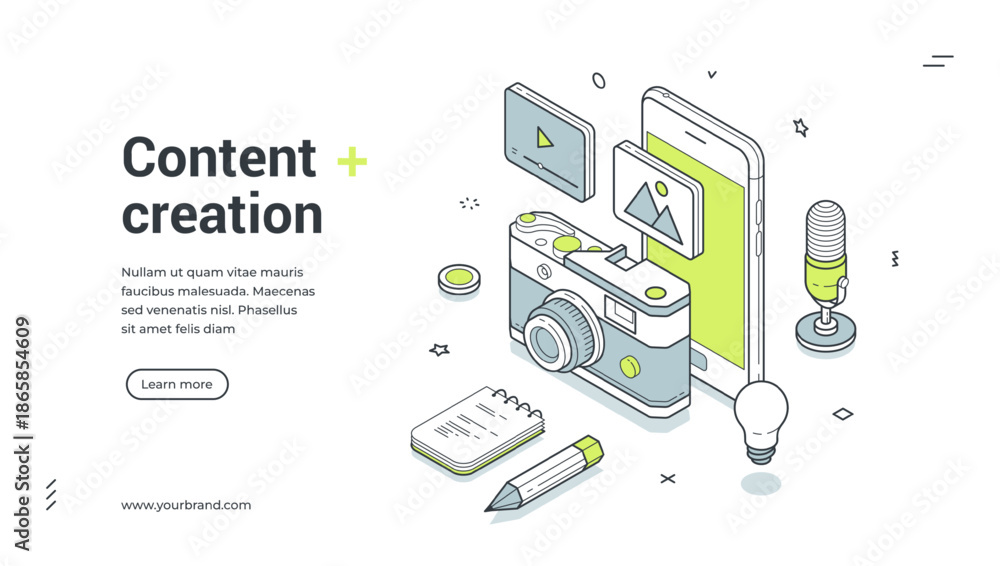 Media content creation cyberspace digital technology isometric web banner design template vector illustration. Multimedia video photo audio files social network internet marketing advertising #1865854609