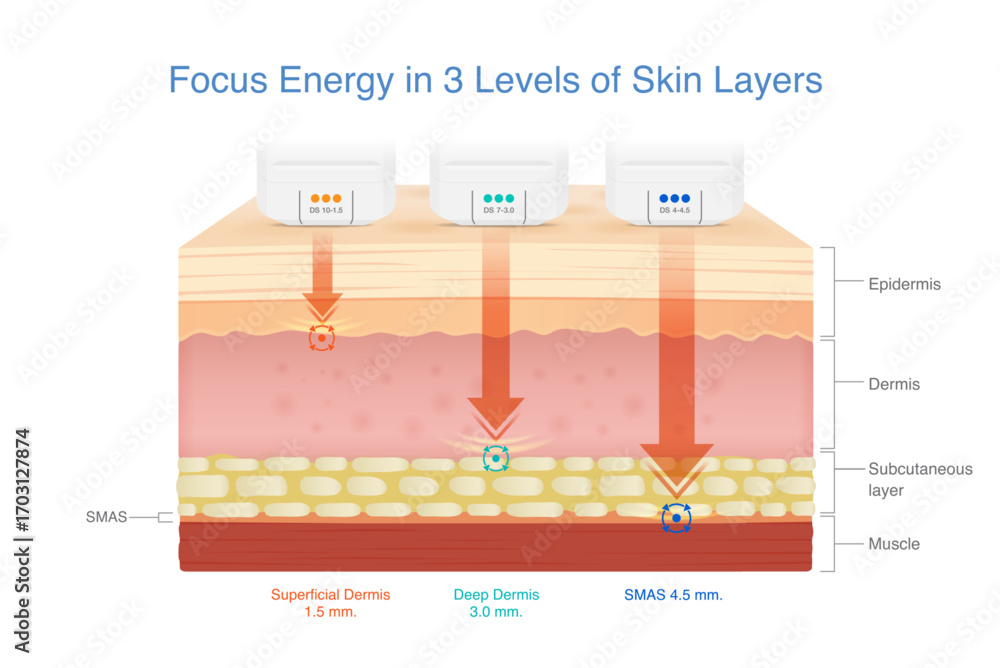 3 Medical devices shoot heat energy to the skin layer at three different depths to SMAS layer. Skin lifting with stimulating collagen and Elastin in skin with Ultherapy and Radio Frequency. #1703127874