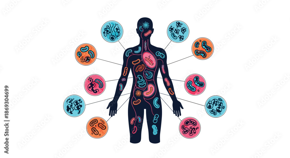 Medical illustration of a human body silhouette showing internal gut microbiota and various types of bacteria for health and science. #1869304699