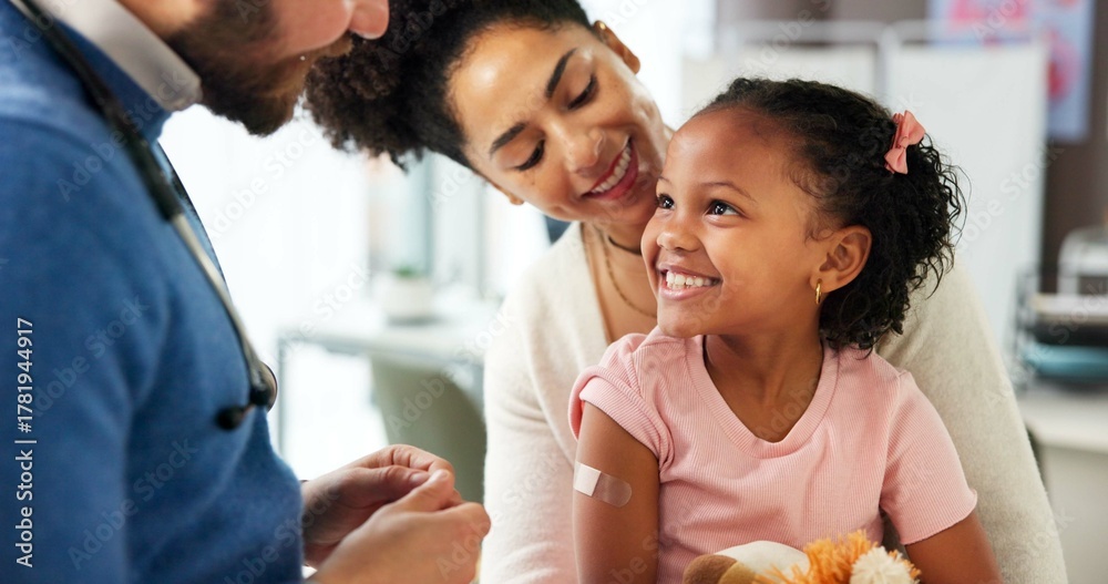 Medical, parent or kid in clinic with plaster, first aid and trust in virus vaccine. Happy, healthcare or pediatrician in hospital with bandaid, immunization shot and support in childhood checkup. #1781944917
