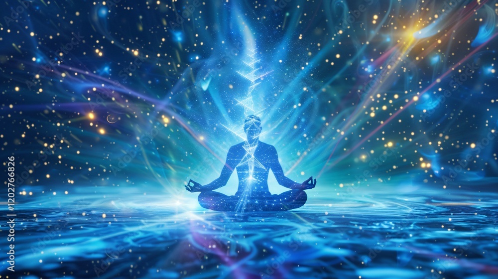 Meditator surrounded by balanced masculine and feminine energies depicted with light and energy #1202766826