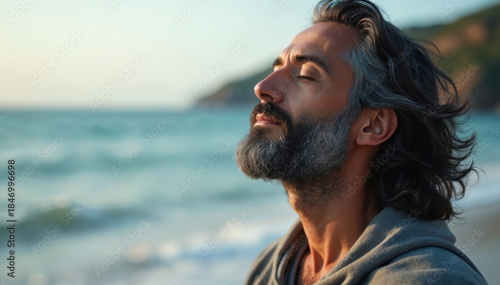 Medium aged man with beard and gray hair breathes deeply near the ocean. He closes eyes feeling peace by blue water and sky. Person finds calm at the beach during summer day. #1846996698