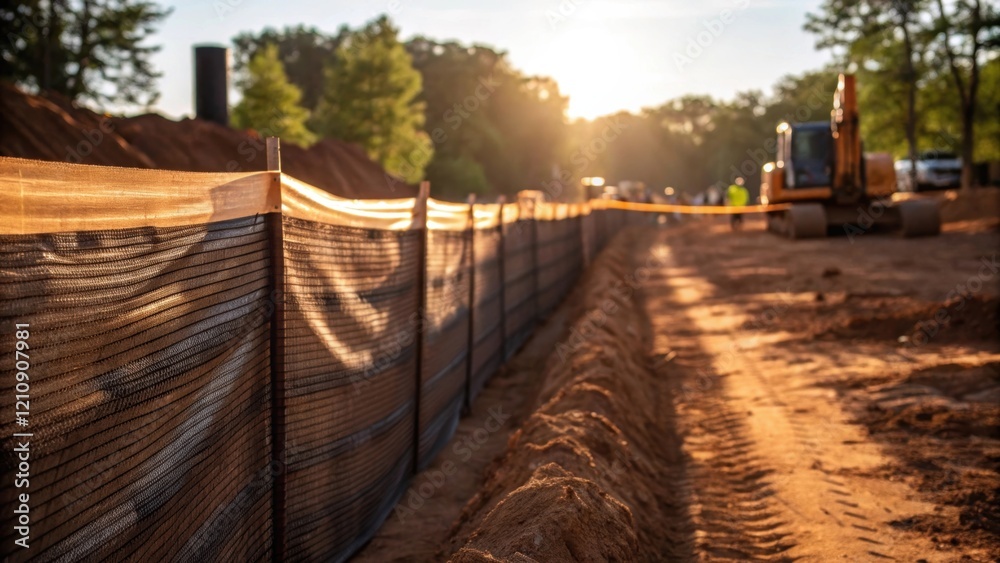 Medium closeup of a construction site with a barrier of silt fencing around a disturbed area capturing sunlight filtering through the fence while demonstrating erosion control #1210907981