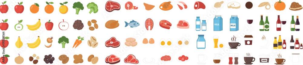 Mega set of flat food and beverage icons featuring fruits vegetables meat poultry seafood dairy products coffee and alcoholic drinks on grey background #1901815164