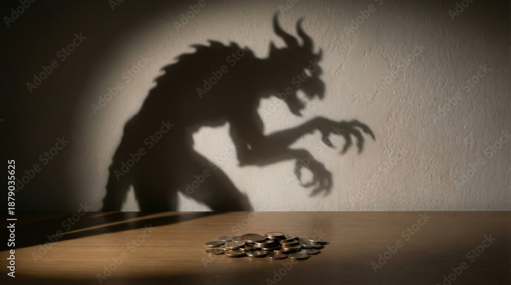 Menacing Monster Shadow Reaching for a Pile of Coins on a Table Symbolizing Greed and Financial Corruption #1879035625