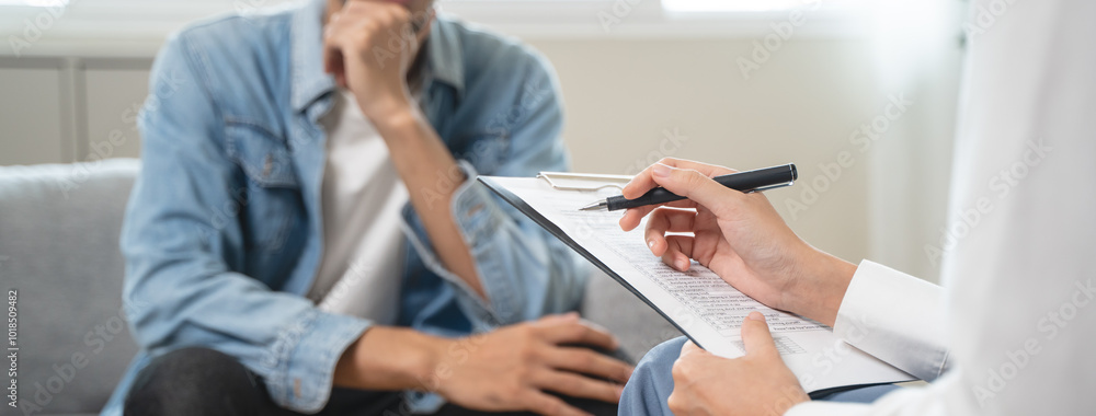 mental health care therapy concept, psychologist counseling to anxiety patient and giving guidance mental therapy care to cure mental health. #1018509482