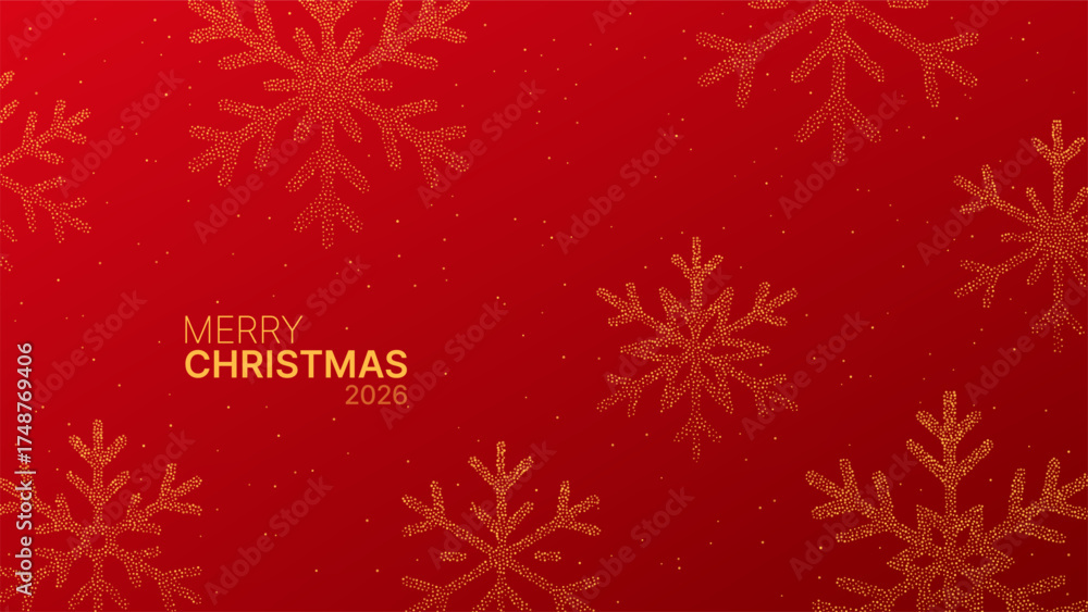 Merry Christmas 2026 text with gold glitter snowflake pattern on a red background. Festive winter holiday greeting card design. #1748769406