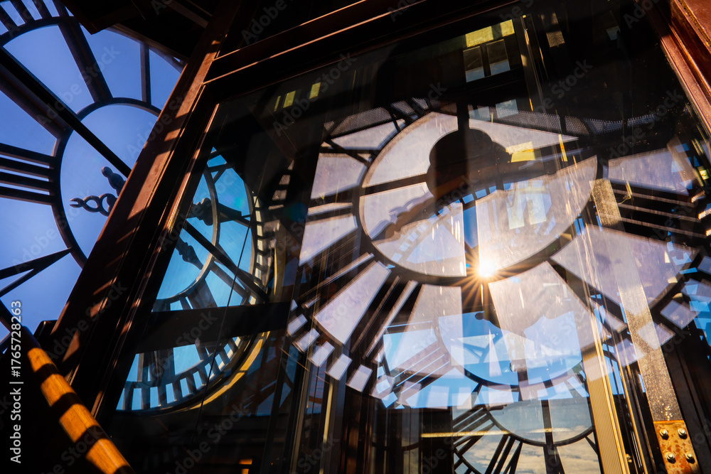 Mesmerizing view of clock tower with sunlight streaming through its intricate glass face creating dynamic reflections. Clock tower #1765728263