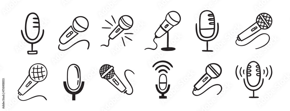 microphone icon doodle hand drawn set. Outline drawing microphone line clipart symbol collection #1761418853
