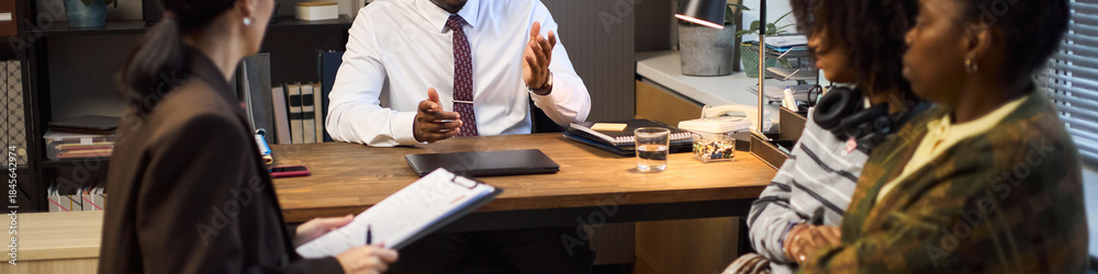 Middle aged Black man sitting at desk talking to two middle aged Black women and one middle aged Asian woman during school principal meeting, discussing documents and addressing concerns #1845642974