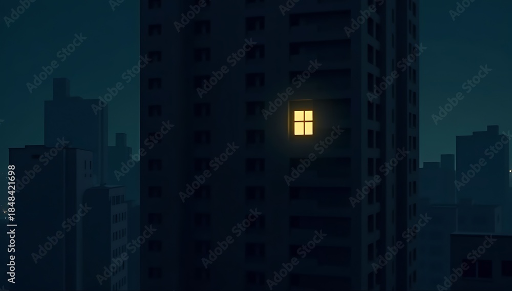 Minimal architectural illustration of a single lit window in a massive dark apartment building, urban loneliness and modern isolation concept, geometric composition, night mood #1848421698