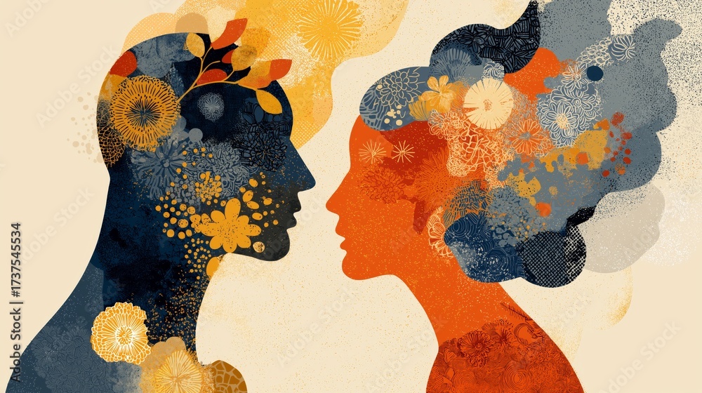 minimal artful poster in health care and supportive concept, man and woman head with floral and flowers on plain background #1737545534