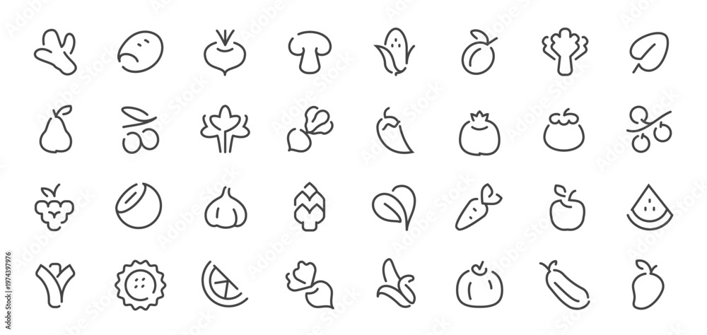 Minimal fruit and vegetable line icons set. Hand drawn organic healthy food outline symbols collection #1974397976