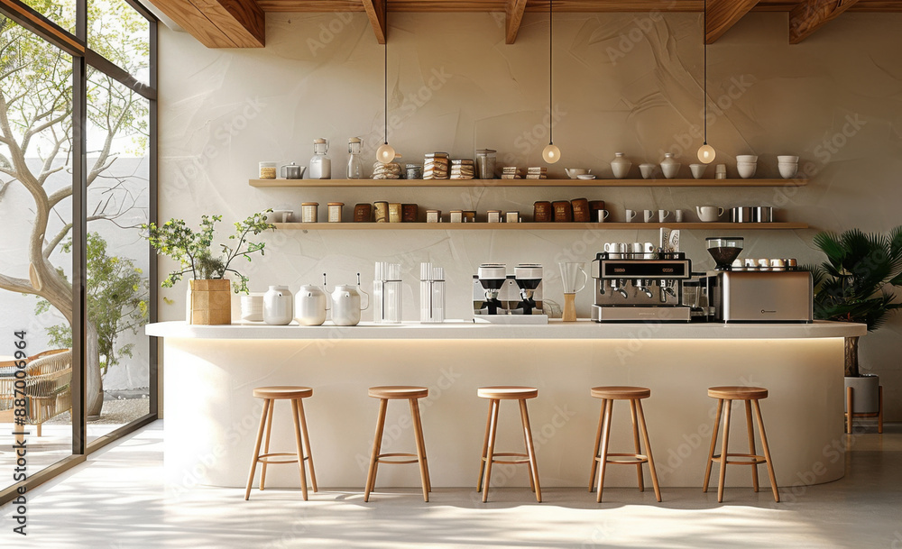 Minimal interior design of cafe or coffee cafe bar shop in clean minimalist style, decorated with warm tone, relaxing tones with glossy ivory white round corner counter and coffee machinery. #887006964