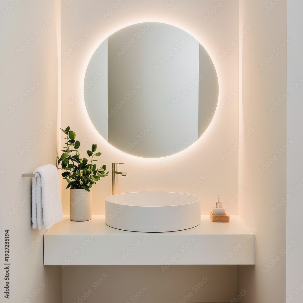 Minimalist Bathroom Vanity Modern round mirror with backlit glow, vessel sink, chrome faucet, plant accent. Contemporary luxury, bathroom design, interior decor #1927235194