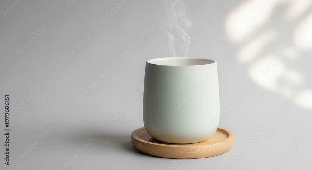 Minimalist ceramic cup with steam rising, placed on a wooden coaster against a soft gray background, showcasing modern design and simplicity in beverage presentation #1979686151