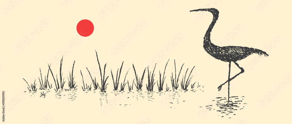 Minimalist japanese style ink sketch heron standing in water with red sun and reeds. Vector Illustration. #1918201993