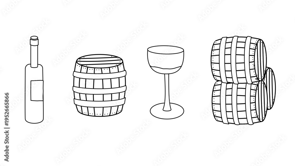 Minimalist Line Art Illustration of Wine Bottle, Glass, and Wooden Barrels #1952665866
