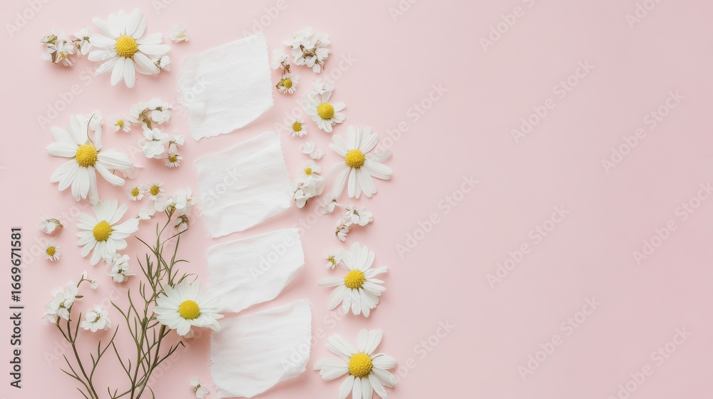 77.Minimalistic flat lay featuring a panty liner with chamomile petals artfully spread across its surface, set against a light pink backdrop, symbolizing gentle, plant-based care for feminine hygiene. #1669671581