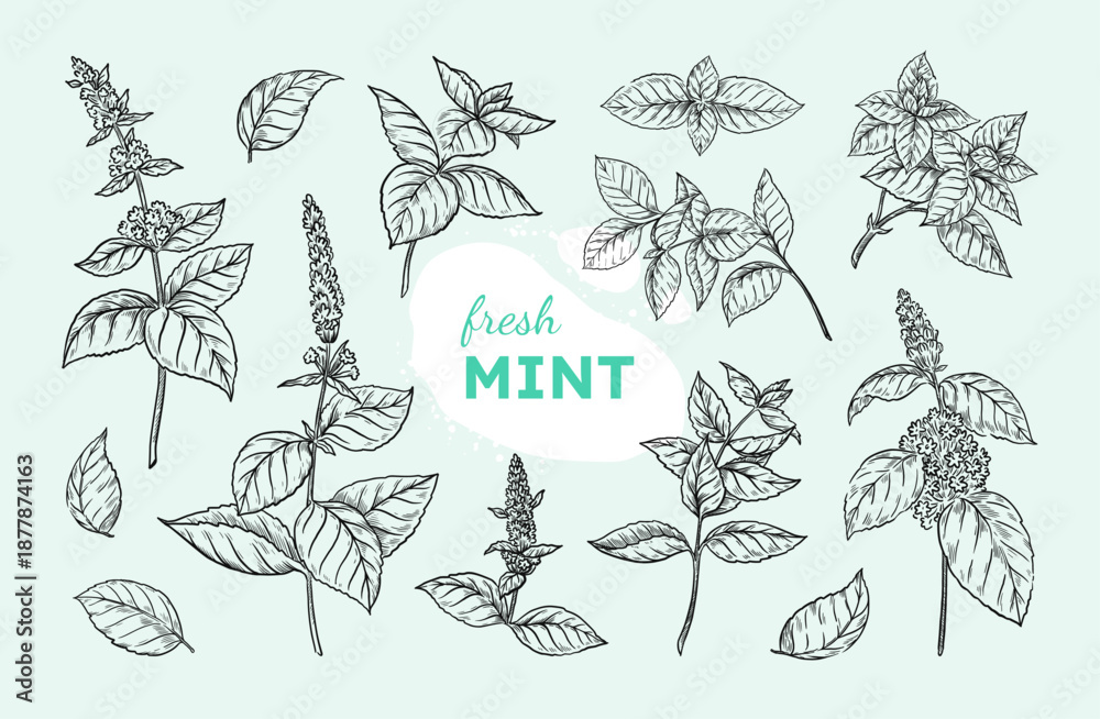 Mint leaf. Peppermint branch sketch, black and white spearmint, hand drawn menthol plant. Botanical herbs, leaves and stems. Condiment or medical flora. Vector doodle isolated elements #1877874163
