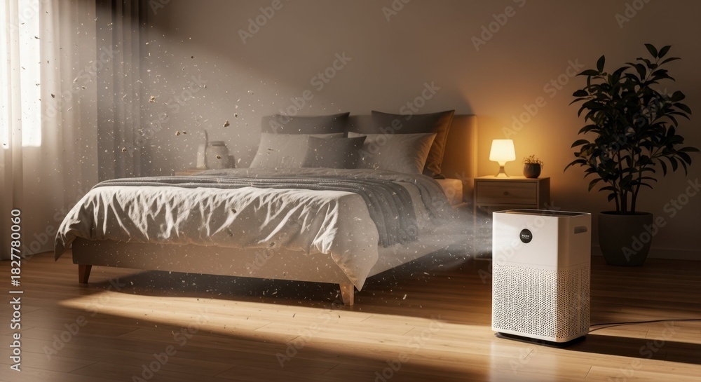 Modern air purifier cleans air indoors. Air purifier eliminates dust, pollen, and allergens, providing healthier living conditions inside bedroom with minimalist furniture. #1827780060