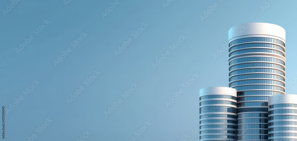 Modern cylindrical skyscraper towers under clear sky, symbolising corporate finance strength, real estate growth, prosperous city skyline, premium headquarters #1793094345